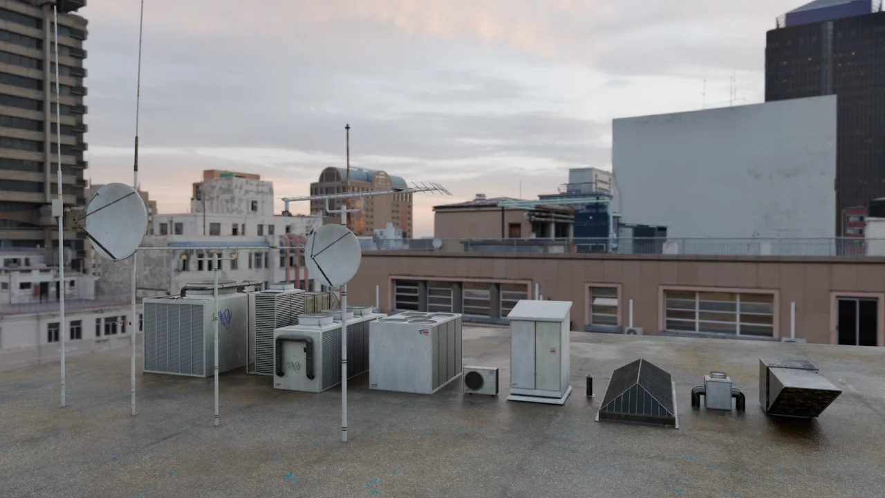A collection of modular rooftop 3D models designed for populating urban environments. The pack includes architectural details such as HVAC units, pipes, vents, and satellite dishes. All assets feature procedural materials configured within Blender, allowing for integration into architectural visualization, kitbashing workflows, and cinematic scenes.