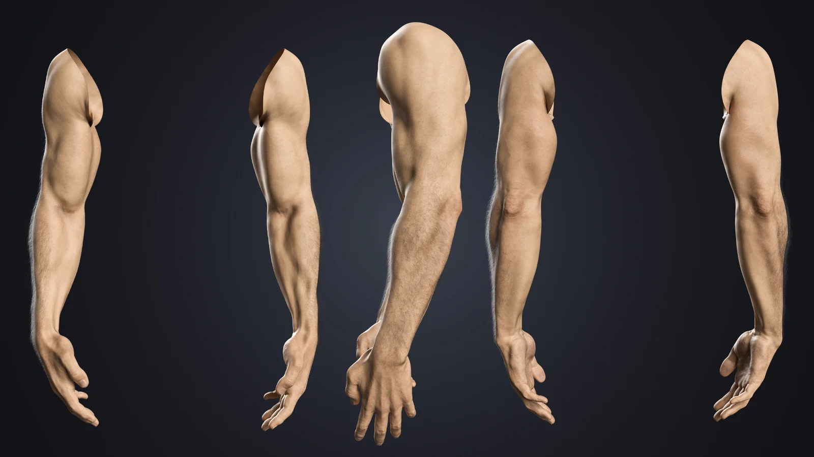 A realistic male hand and arm 3D model designed for jewelry visualization, product shots, and character close-ups. The model features quad-only, subdivision-ready topology with UDIM UVs. It includes 8K 32-bit EXR displacement and normal maps, alongside 4K base color and roughness textures.
