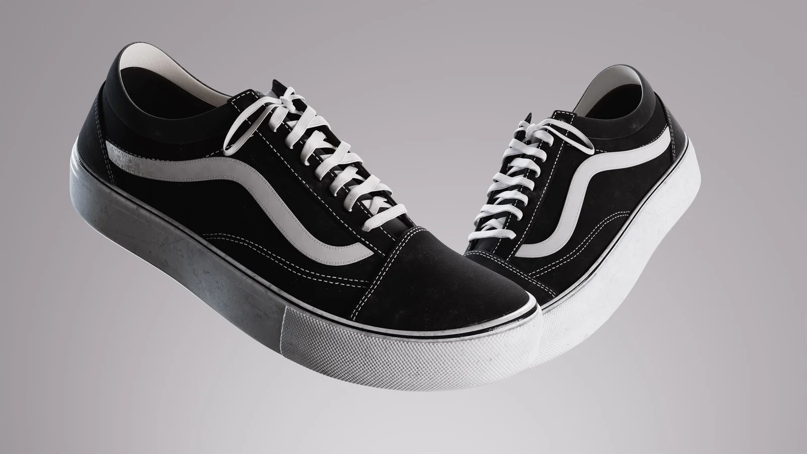 A 3D model of classic skate shoes, originally created as part of a video tutorial series. The package includes the original ZBrush tool files for high-poly adjustments and the Substance Painter file for modifying the highly detailed textures. The promotional images were rendered using Octane.