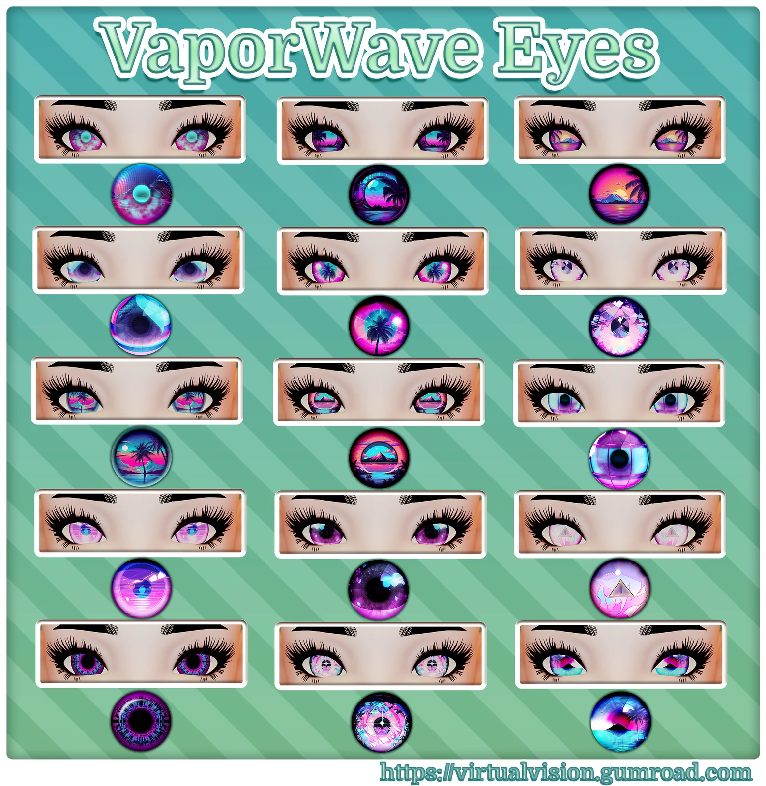 A collection of 15 vaporwave-themed eye textures designed for 3D characters, avatars, and VTubing models. The textures are provided in standard PNG format and feature bright, vibrant anime-style circle eyes. The base images were generated using AI and subsequently edited by the creator.