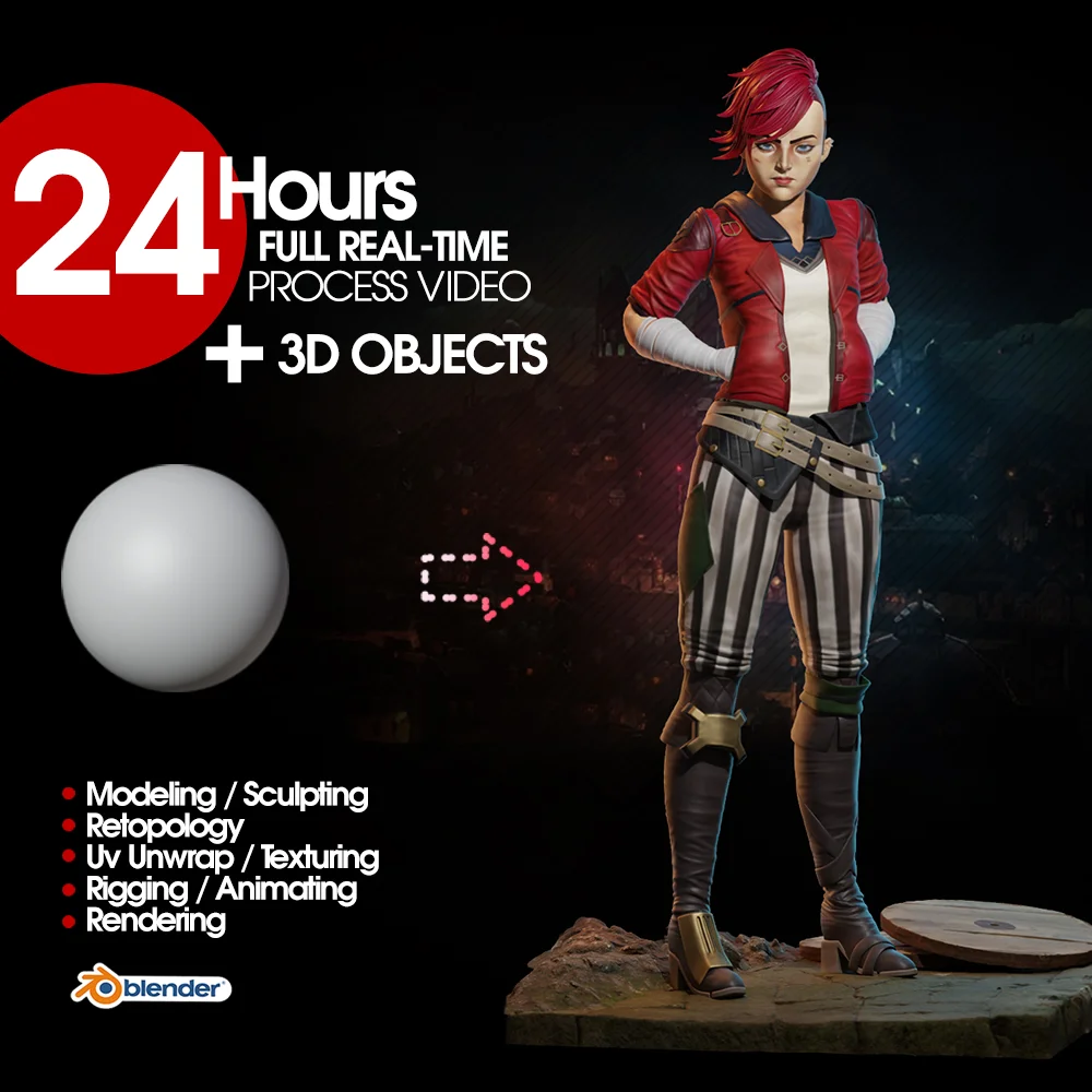 A full 24-hour, real-time video detailing the complete character creation process for Vi from Arcane in Blender. The footage covers the entire workflow from start to finish, including sculpting, modeling, retopology, UV unwrapping, texturing, painting, rigging, posing, and animation. The video consists of raw, unedited footage without voiceover commentary. The package also includes the final 3D character model files.