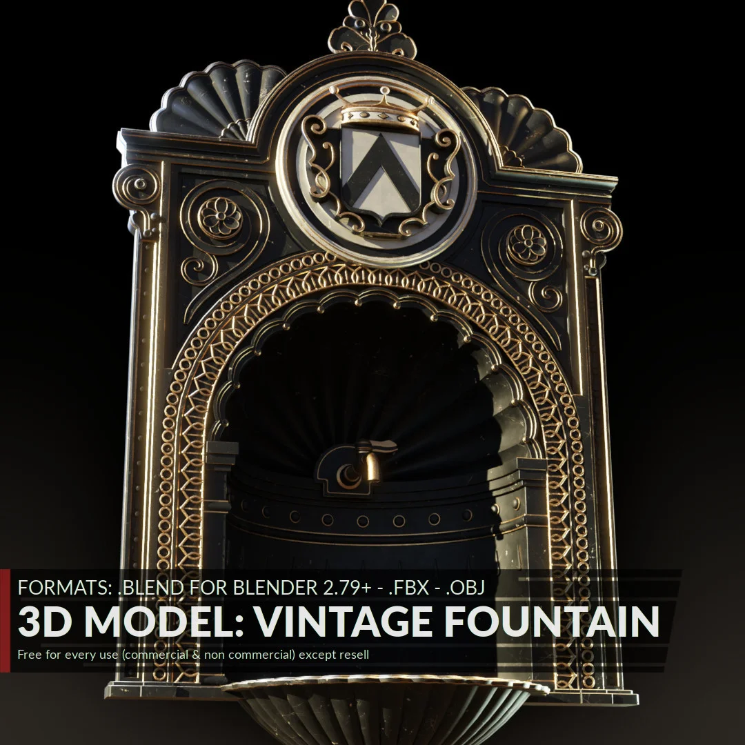 A 3D model of a vintage public wall fountain. The asset is provided as a native Blender file configured with Principled BSDF materials, and includes exported FBX and OBJ formats for compatibility with other 3D software.