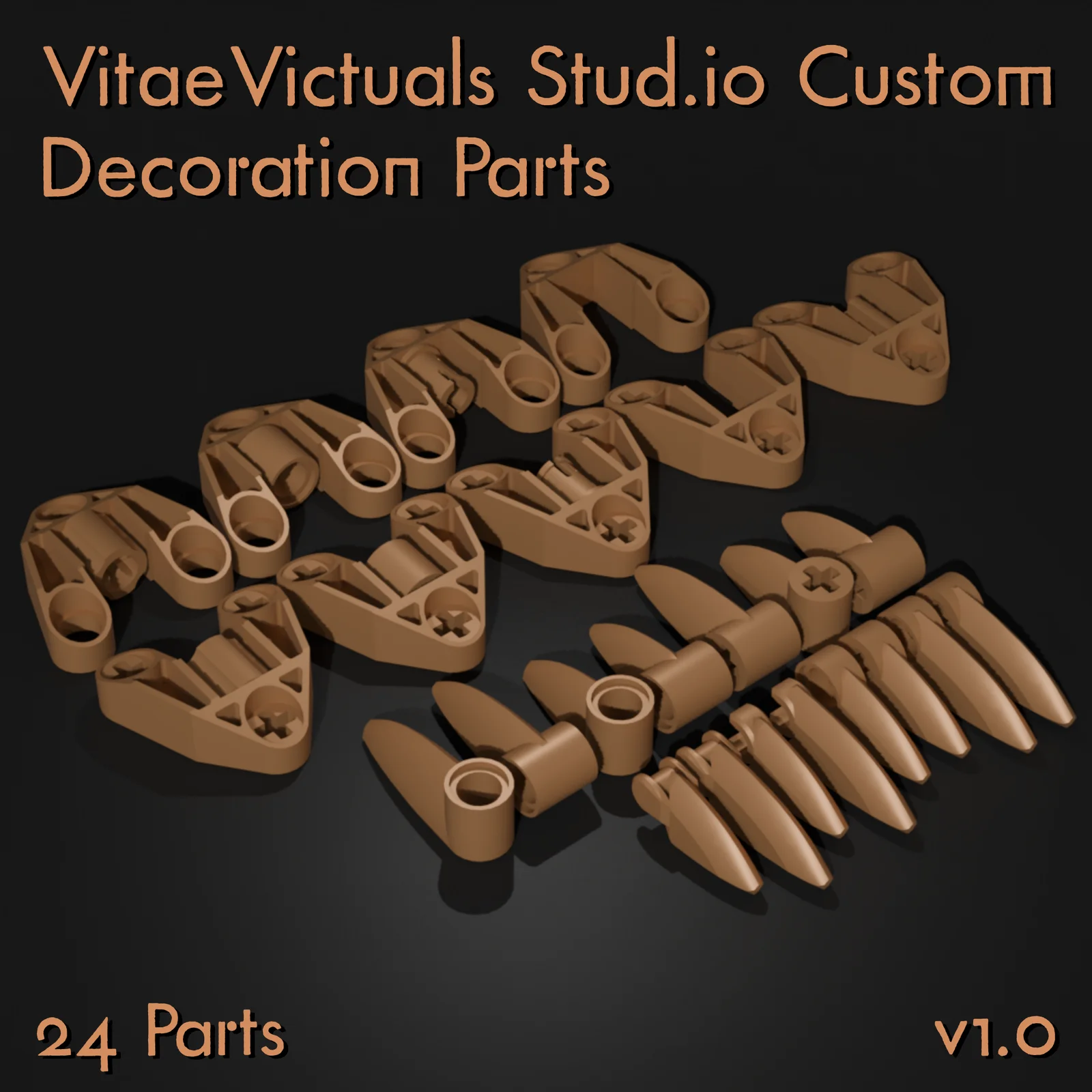 A collection of 24 bespoke 3D models designed to match the aesthetic of specialized LEGO technic and constraction pieces. Originally modeled in Plasticity and processed in Blender, the collection includes standard OBJ files for use in general 3D workflows alongside files formatted specifically for Stud.io.
