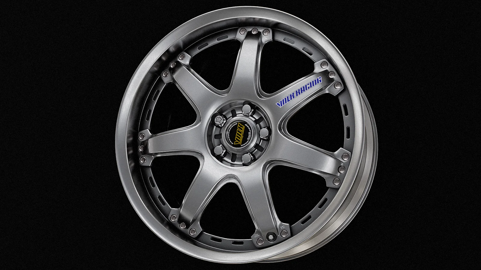 A 3D model of a Volk Racing GT-7 wheel. The asset was modeled in Blender and features textures created in Substance Painter. The geometry ranges from 113,000 to 148,000 polygons depending on the configuration.