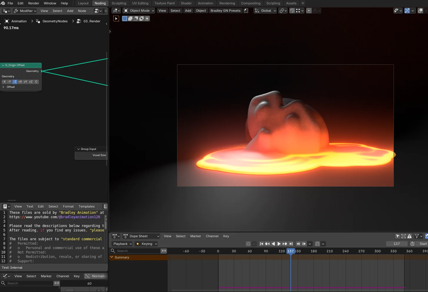 This bundle provides a collection of Geometry Nodes setups and tutorials focused on volume grids and simulations. The package includes working Blender files and instructional videos for various procedural effects, such as flow field obstacle avoidance, melting objects, slime branching simulations, and volume destruction.