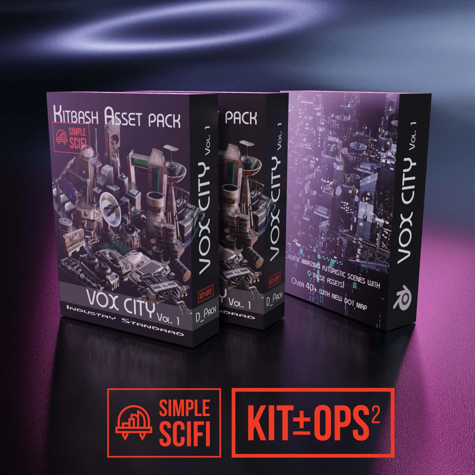 A collection of over 40 sci-fi industrial kitbash assets designed specifically for the Simple Sci Fi add-on. The package includes seven industrial buildings, six greebles, five pipe sets, along with various environmental details like steel barrels, construction elements, and storage tankers. The models are vertex painted and prepared for geometry nodes instancing.