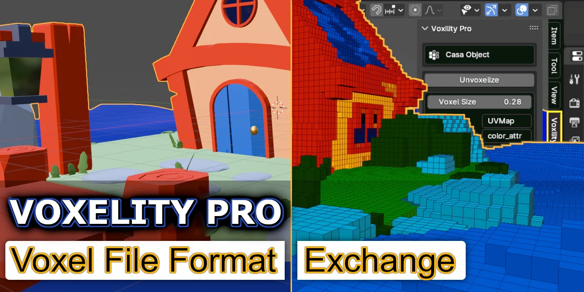Voxelity Pro is a tool for importing and exporting various textured voxel file formats directly within Blender. It supports formats from external voxel editors, including MagicaVoxel (.vox), Qubicle (.qb), Voxlap (.vxl), and VoxEdit (.vxm). Users can customize their workspace by configuring which specific formats remain visible in the standard import and export menus. Additionally, the tool includes a built-in voxelization feature that allows users to convert standard textured 3D meshes into voxel representations without leaving the application.