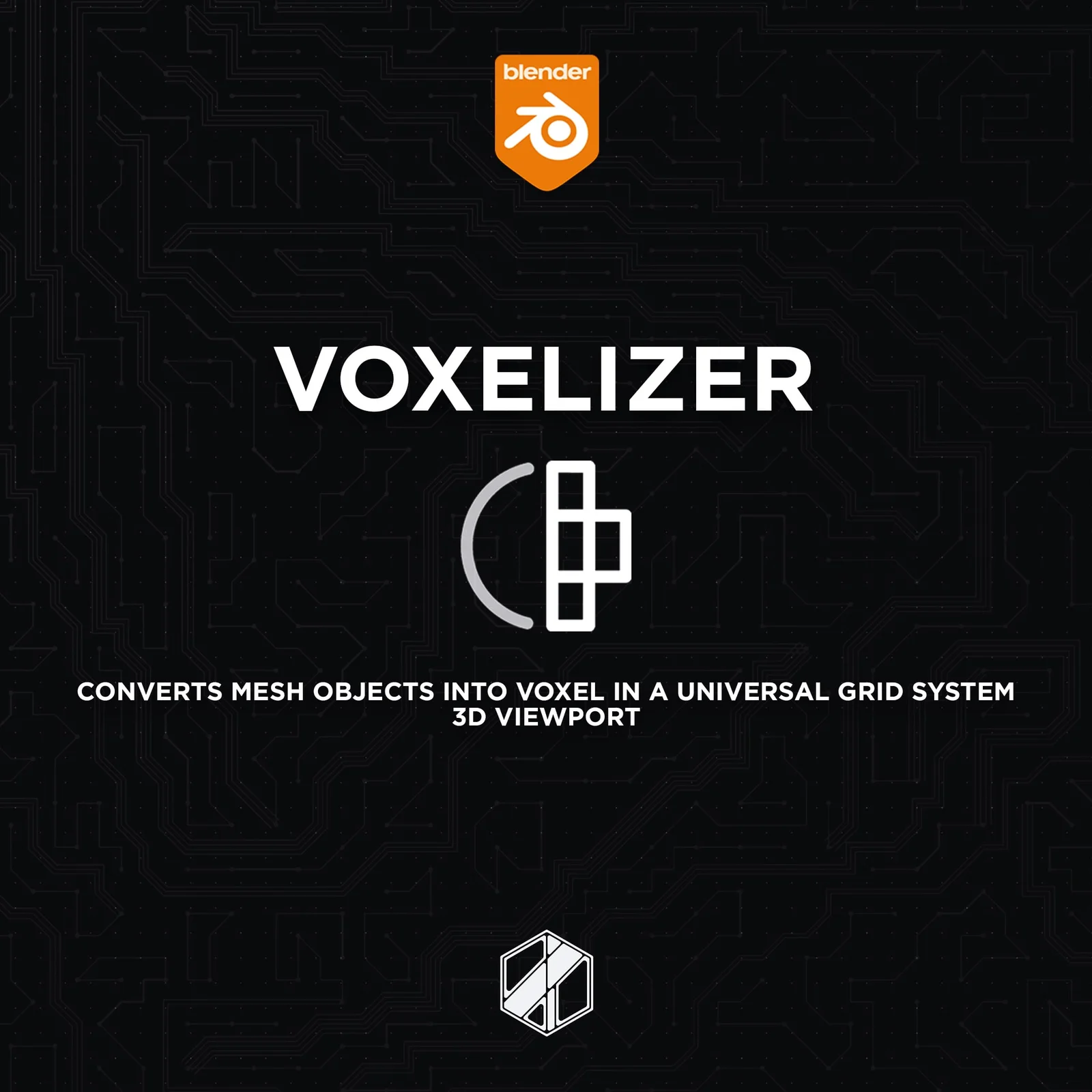 Voxelizer is a tool that converts standard 3D meshes into voxel-style cubes based on a universal grid system. Users can adjust the voxel resolution, set the proper bounding box origin, and snap elements to the grid. The tool operates from a custom tab in the 3D viewport and supports content-aware editing, providing a workflow for generating Minecraft-style assets and abstract 3D elements.