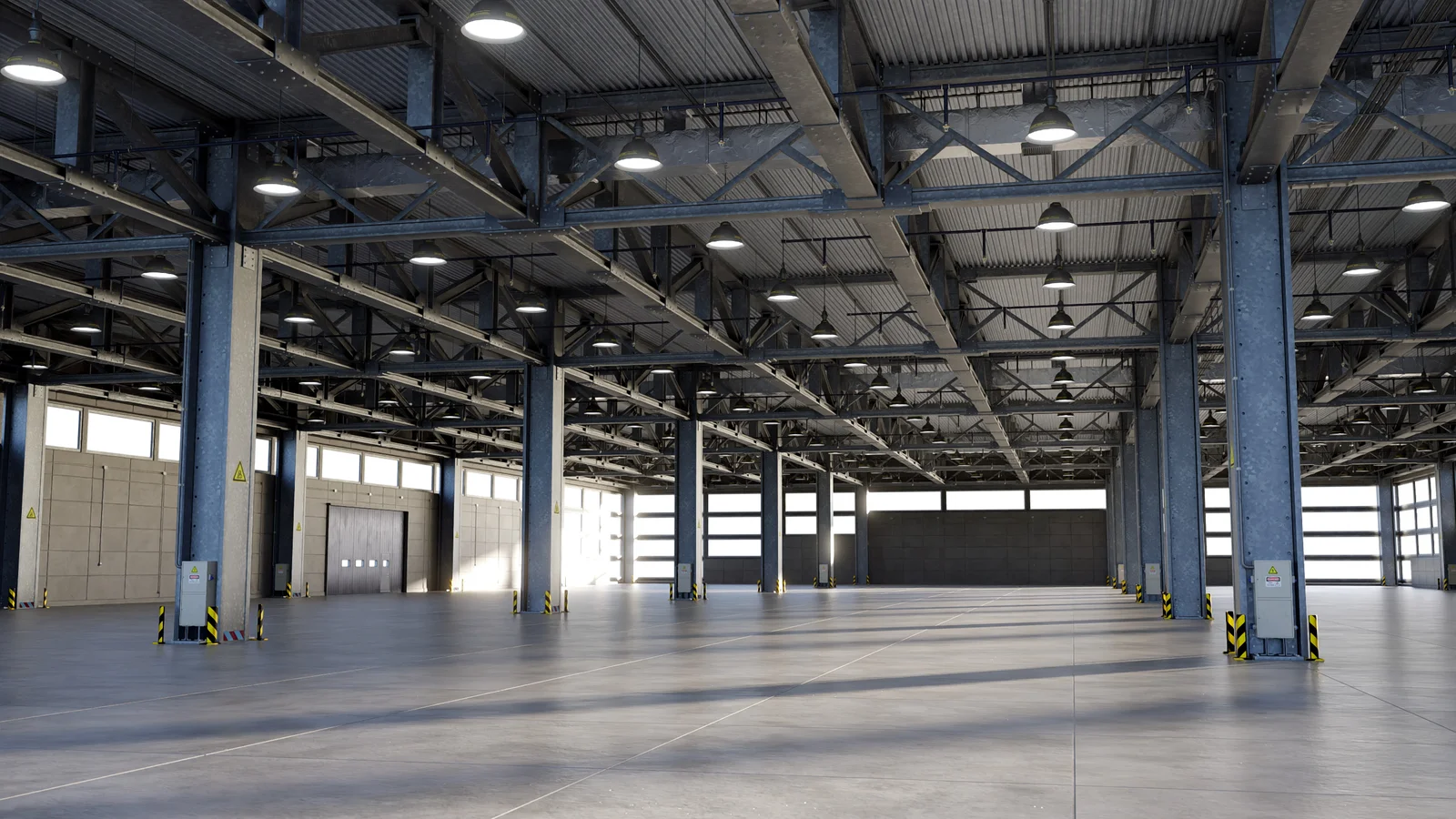 This product provides a high-resolution 3D model of a large warehouse environment. Built to real-world scale, the structure measures 111 meters long and features clean topology with over six million faces. The native Blender file is fully configured for the Cycles render engine, including embedded 2K and 4K textures alongside a complete lighting setup for immediate rendering. Exported FBX and OBJ files are also included for use in other 3D applications.