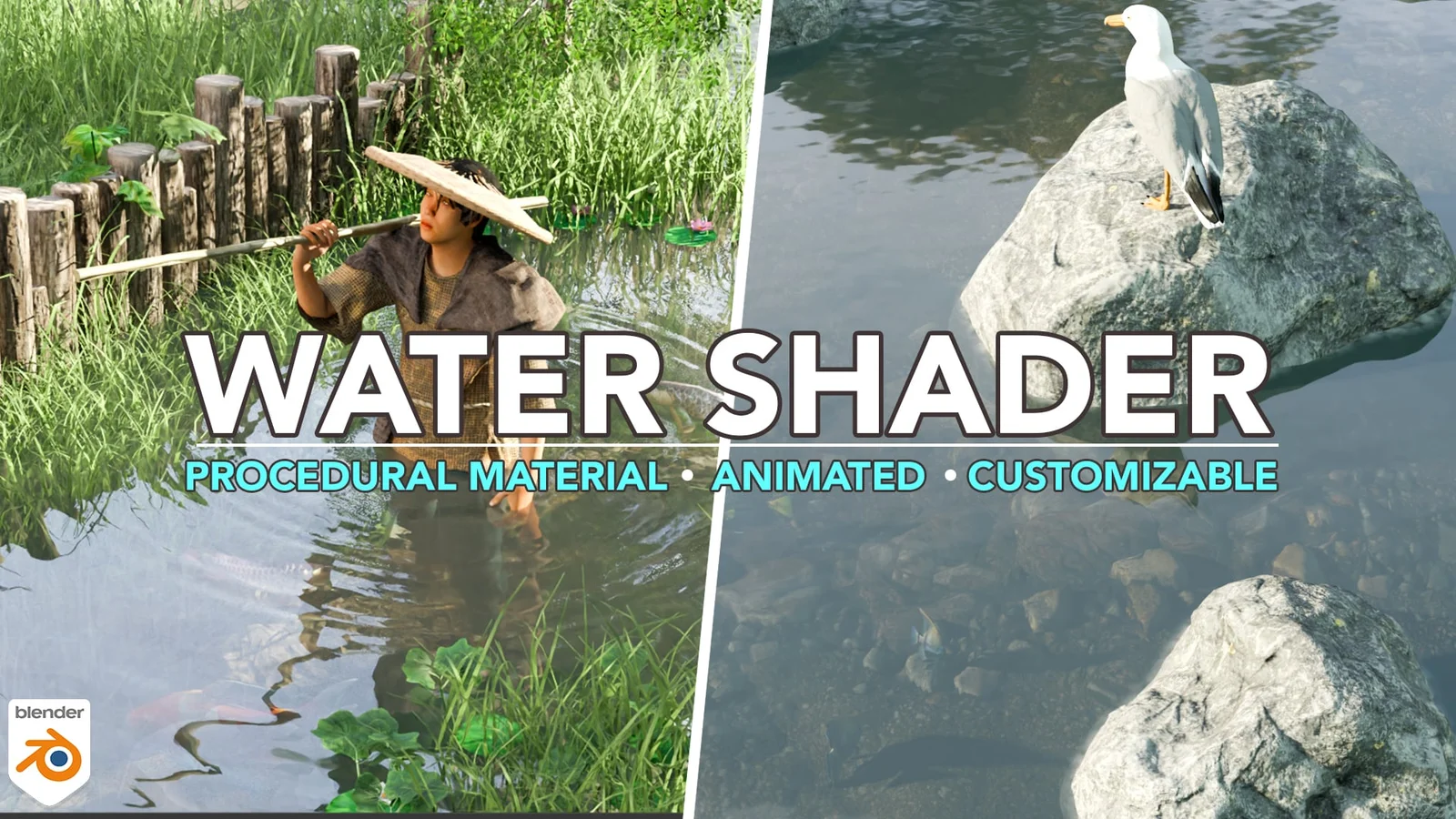 This water material provides an animated, customizable surface for fluid rendering in Blender. Users can adjust settings directly in the material properties, including a toggleable accumulated foam effect that appears around intersecting objects. The setup includes a dedicated modifier for scaling the water plane without manually transforming the geometry. It is pre-configured for the Asset Browser for immediate use in scenes. A premium version is available that includes additional example environments featuring a character and animated fish.