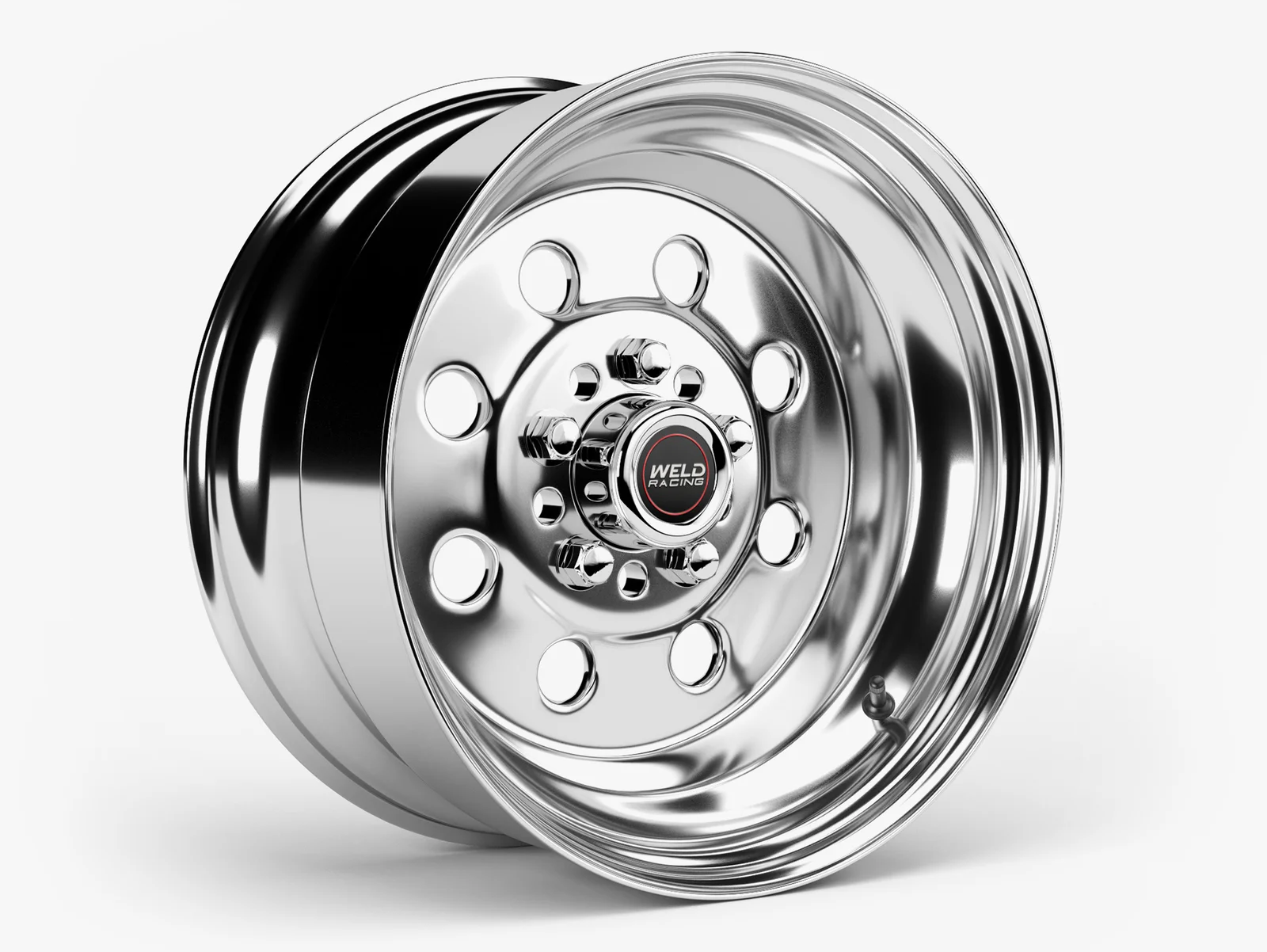 This asset is a highly detailed 3D model of a 15 by 8-inch Weld Draglite racing wheel, built to real-world scale and centered on the origin. The base geometry contains 7,886 polygons, which subdivides to 126,160 polygons when smoothed. It includes 1K resolution diffuse and bump texture maps in JPG format. The model is delivered in standard FBX and OBJ formats, alongside a Maya project file configured with Redshift materials.