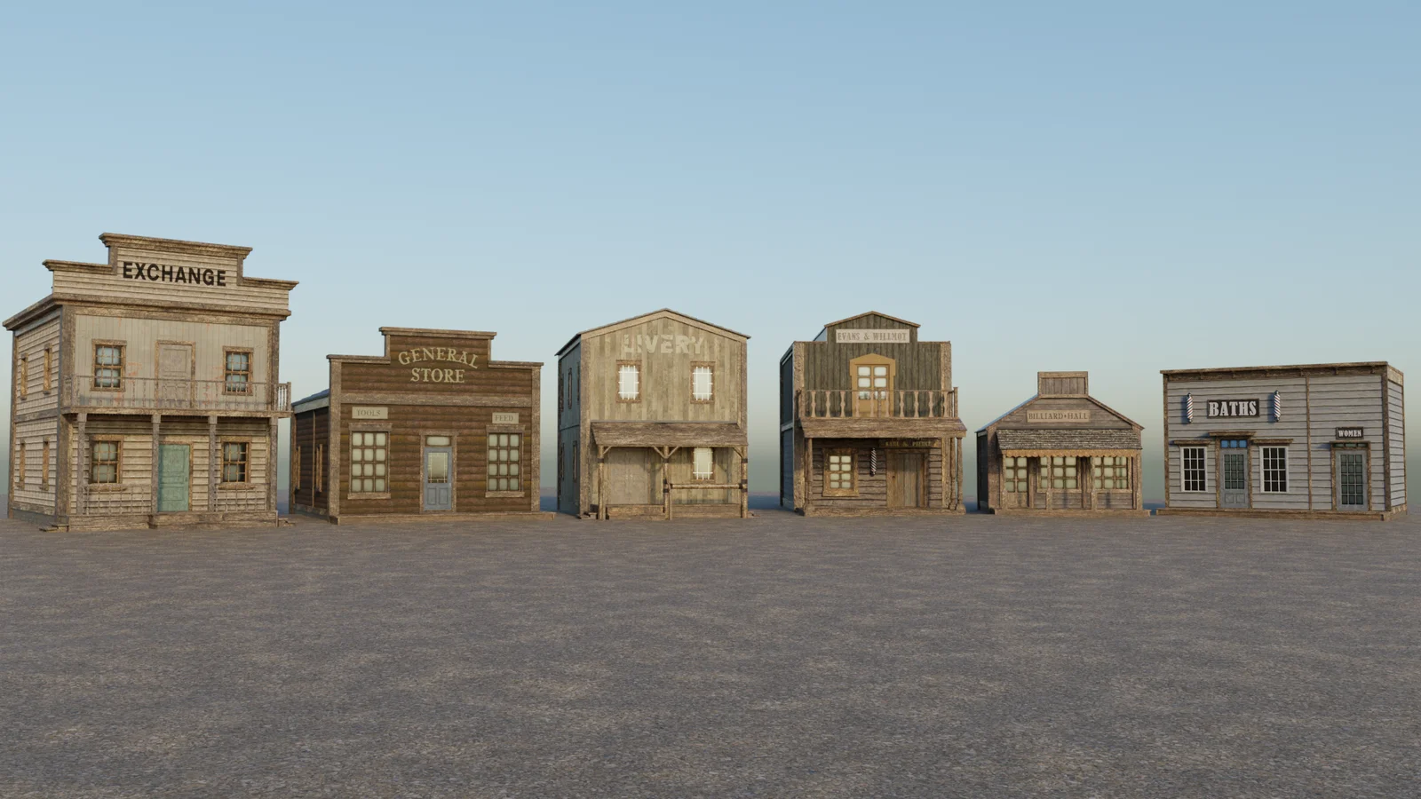 This collection provides six building models designed for Western town environments, including a livery, general grocery store, exchange building, billiard hall, bathhouse, and a dual barbershop building. The signs on these structures are applied using transparent PNGs with the Shrinkwrap modifier, allowing for straightforward replacement with custom designs.