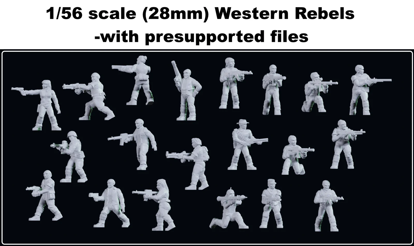 A collection of 3D printable miniature figures themed around western rebels, militia, and insurgents. The models are provided at a 1/56 scale, which translates to roughly 28mm to the eye level. The package includes both standard and presupported files to facilitate the 3D printing process. These figure sets are designed to be flexible and can be scaled by the user to dimensions as small as 10mm or as large as 38mm (1/48 scale) to suit different tabletop scales.