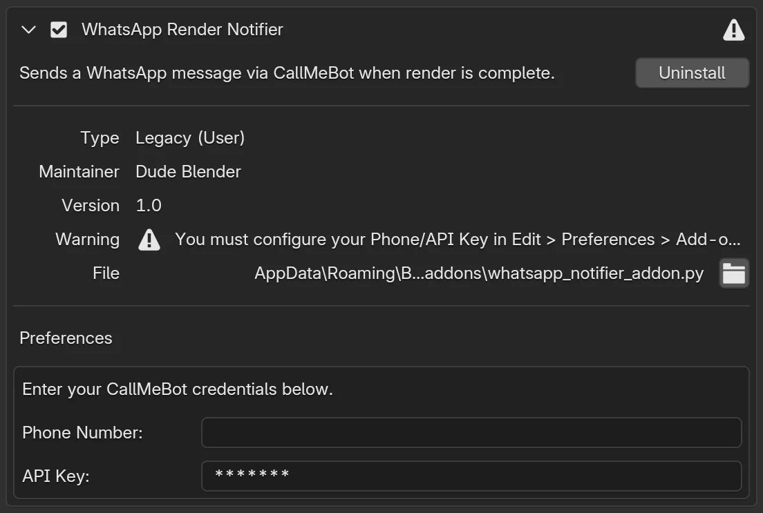 WhatsApp Notifier is an add-on that sends an automated WhatsApp message when an active render finishes. It provides a simple notification system to monitor rendering progress remotely without needing to check the Blender interface directly.