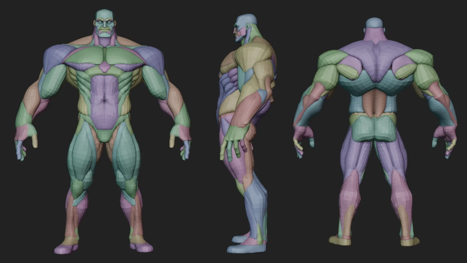A stylized hero anatomy blockout designed to serve as a starting point for character creation. The model is separated into distinct anatomical parts, including the head with basic facial features, torso, arms, hands, and legs. It is provided in multiple standard formats for integration into various 3D workflows.