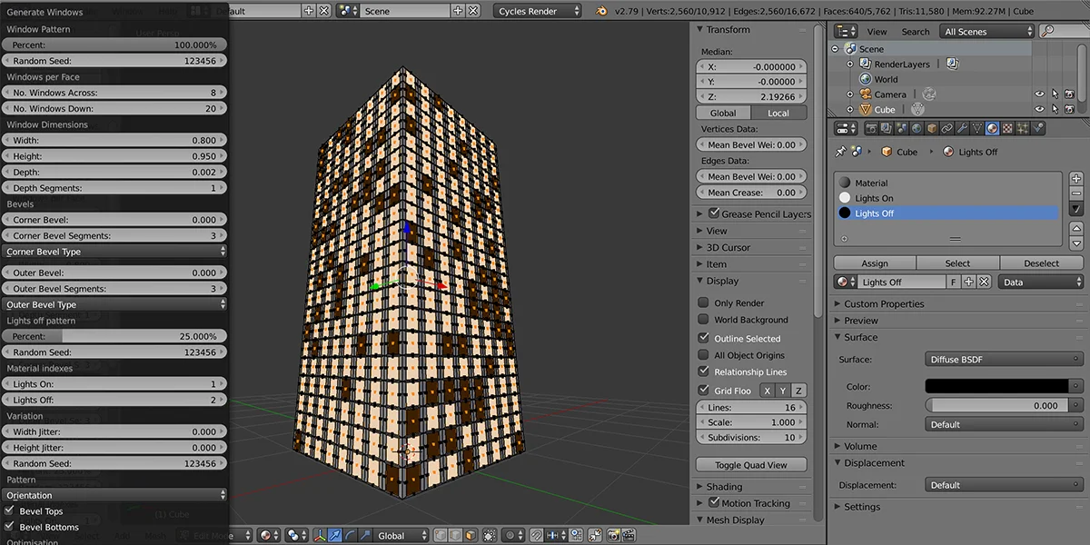 The tool assigns materials to generated windows using a slot ID and can selectively apply a secondary material to simulate deactivated lights. Further customization involves adding jitter to window dimensions, handling edge splits for shading, and generating UV seams. It supports mapping orientation adjustments across faces and provides refinement options to clean up topology after generation. It is built to complement workflows using other Configurate generators.