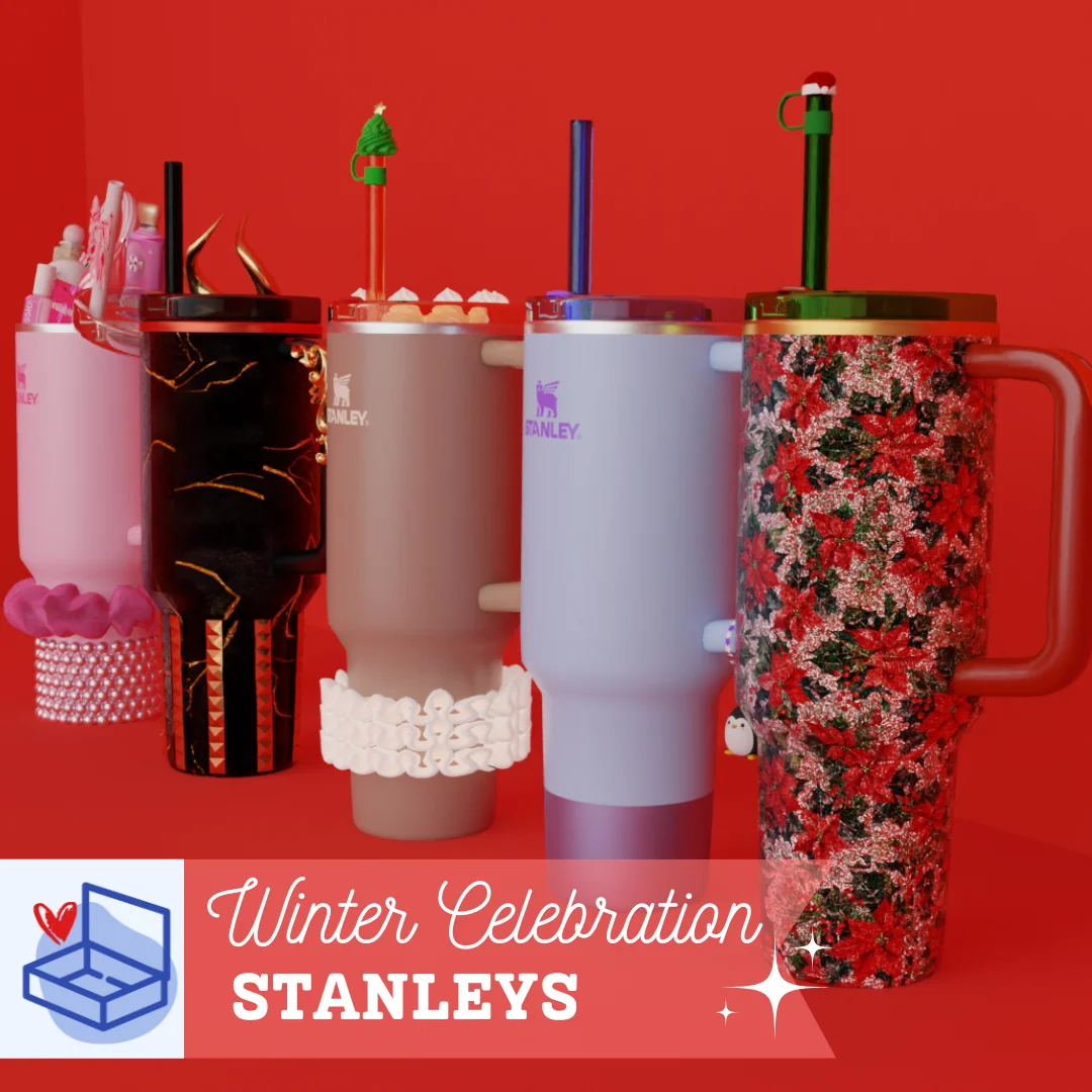 This set contains five seasonal 3D models based on Stanley tumblers, designed for use in Blender. The collection features various holiday themes including a Pink Sugarplum Fairy tumbler with self-care items, a Krampus version with glitter marble texture, a Frosty Penguin tumbler with a keychain, a Cocoa Cookie Confection design with icing and a gingerbread topper, and a Glitter Poinsettia variant with a removable straw cover. Some models include distinct hardware details and removable components.