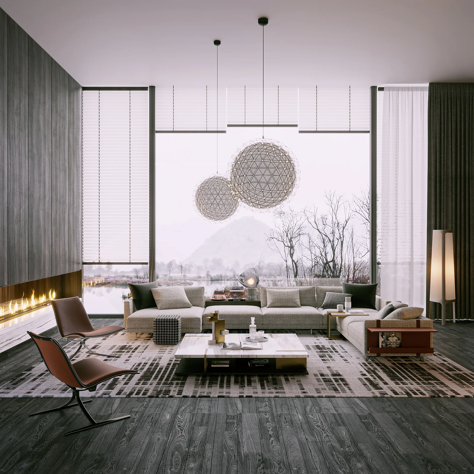 This product provides a complete interior living room scene designed around a winter aesthetic. The environment features dark-toned wooden flooring, burnt orange leather chairs, a fireplace, and large windows looking out onto a snowy exterior landscape. The scene is organized with named assets and layer management, utilizing textures ranging from 1K to 4K resolution. The Blender version is natively set up for both the Cycles and EEVEE render engines.