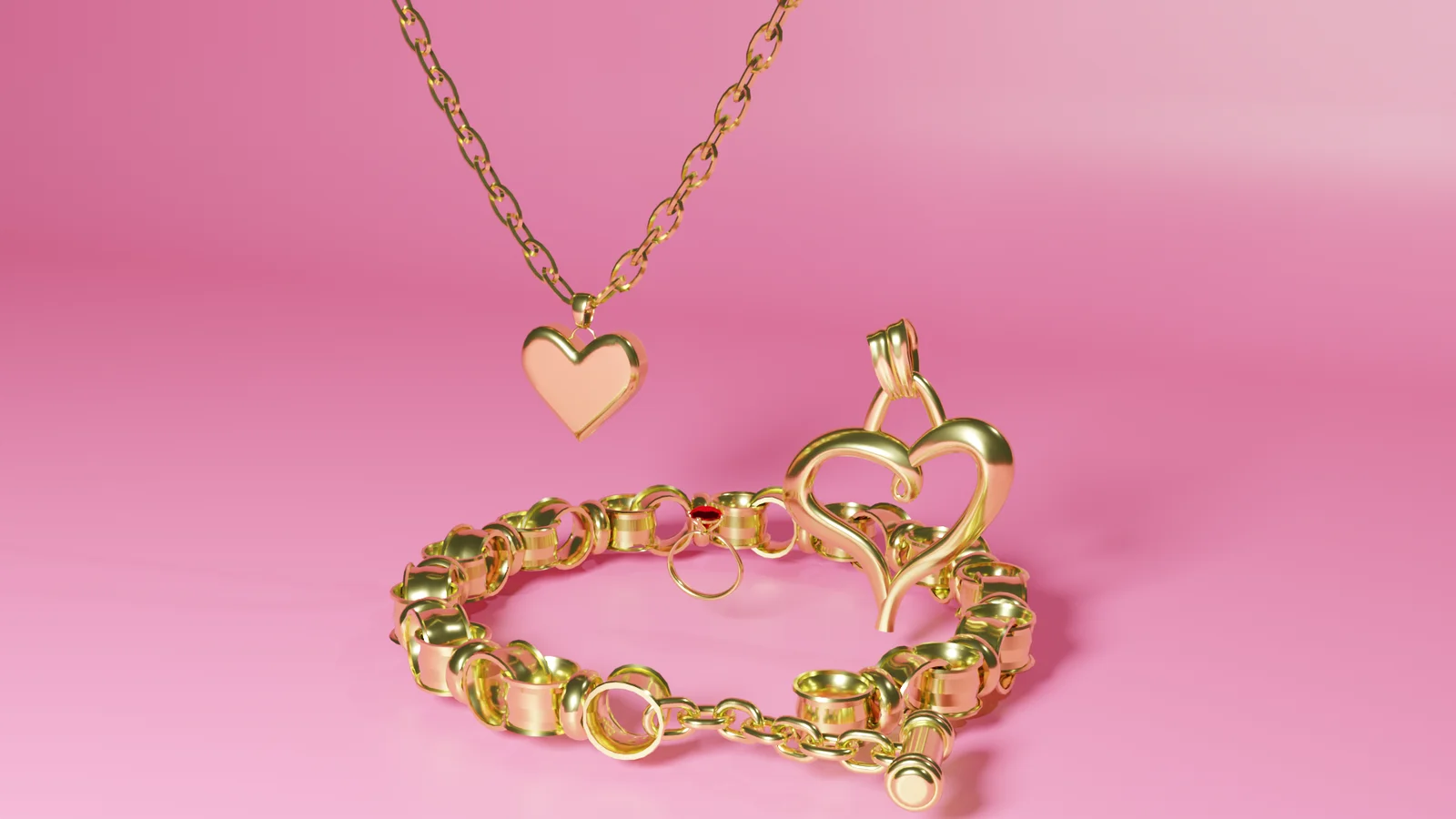 This collection provides a set of 3D jewelry models, featuring a heart necklace, a heart keychain, an open-ended bracelet, and a ring. The package includes basic textures such as gold, chrome, and watermelon color variations. The models are designed to be paired with custom gem or crystal shaders in Blender or Unity to achieve a polished gemstone or metallic appearance.