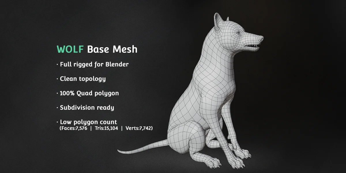 This product provides a rigged wolf base mesh designed for quadruped sculpting and animation workflows. The mesh features clean, all-quad topology that is subdivision-ready. The model has a low polygon count, consisting of 7,576 faces and 7,742 vertices. It includes a custom rig interface and is set up with clean paint weights. Note that the model does not include UV mapping or textures.