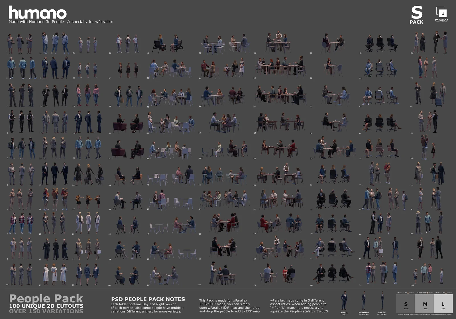 A collection of 2D cutout figures designed to populate wParallax 32-bit EXR interior maps. The pack provides 100 unique model cutouts, each featuring both day and night lighting variations, yielding over 150 possible options. It also includes 15 retail mannequin cutouts for commercial scenes. The assets are organized within a single Photoshop file, allowing users to composite the figures directly into parallax EXR maps using an image editor before bringing them into a 3D environment.