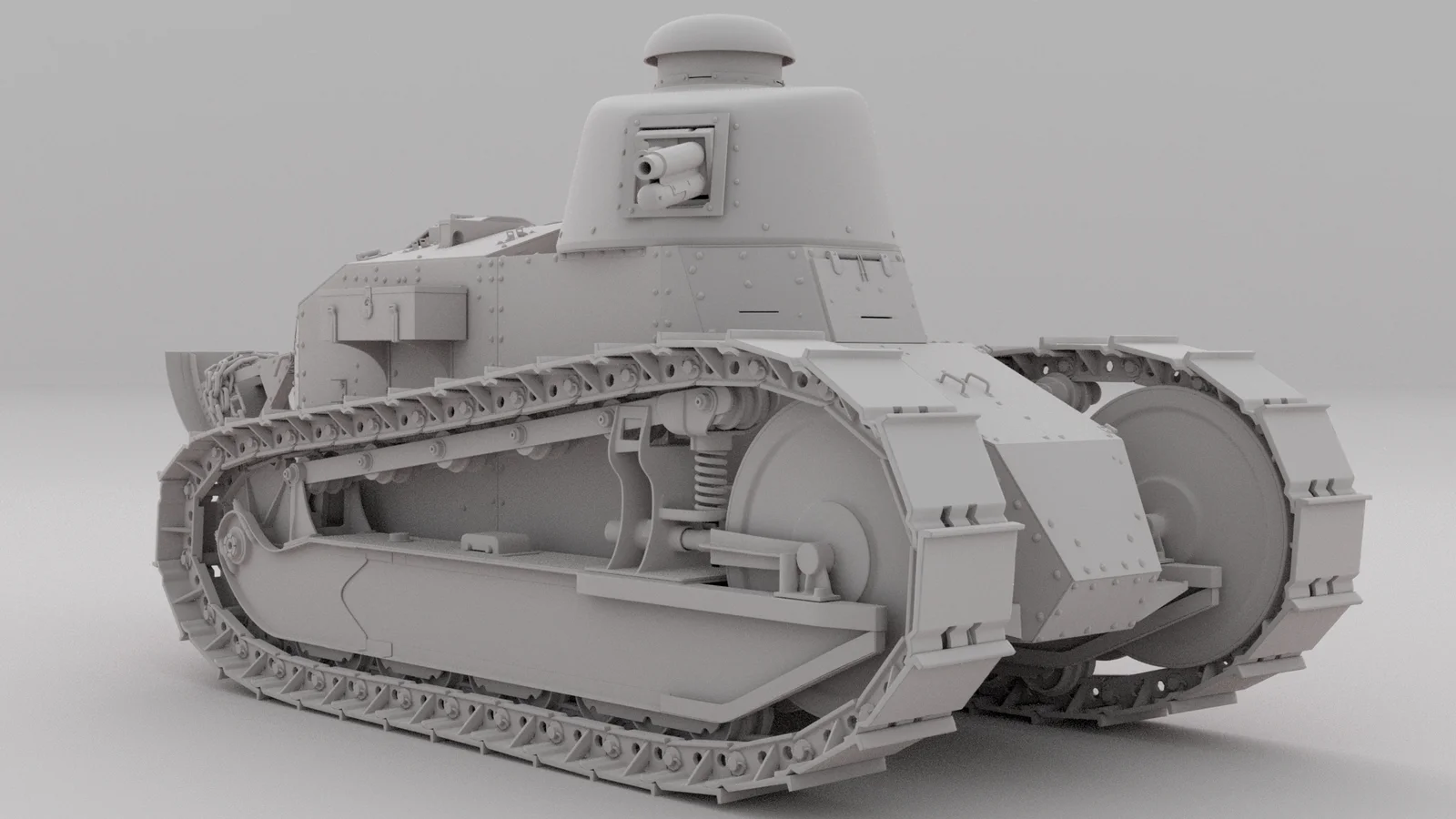 A 3D model of the World War 1 Renault FT-17 tank. The model is provided as a clean, level-0 base mesh that is ready for subdivision. It includes UV mapping organized across seven UDIM tiles, allowing for high-resolution texturing workflows. The asset is delivered in OBJ format.