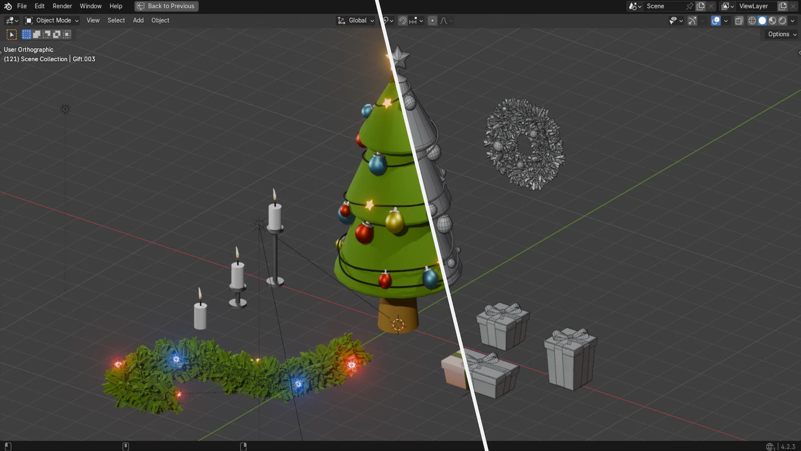This pack provides a collection of Christmas-themed 3D models alongside a procedural garland-making tool. The included assets consist of three gift variations, a decorated Christmas tree, and three candles equipped with auto-animated flame sprites. The included wreath and garland utilize a procedural system to automatically distribute leaves along a base tube mesh, allowing users to reshape the greenery simply by moving the underlying vertices. All models are optimized to share a single UV-based material utilizing a bundled gradient texture palette.