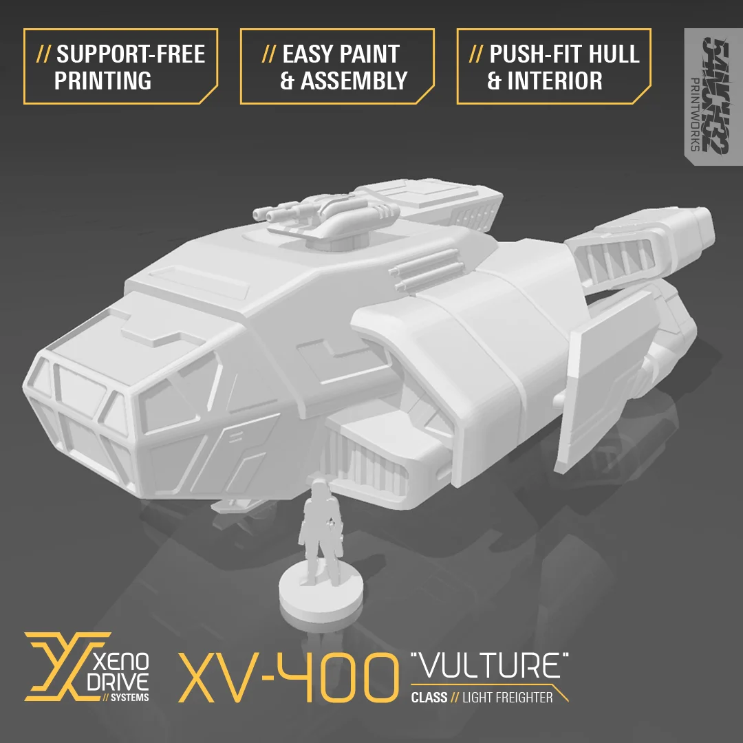 The XV-400 is a 1:48 scale light freighter starship designed as a terrain piece for 3D printing. The model is optimized for FDM printing without the need for supports. The kit features a playable interior suitable for tabletop combat games and RPGs, a rotating turret, and a functioning door ramp.