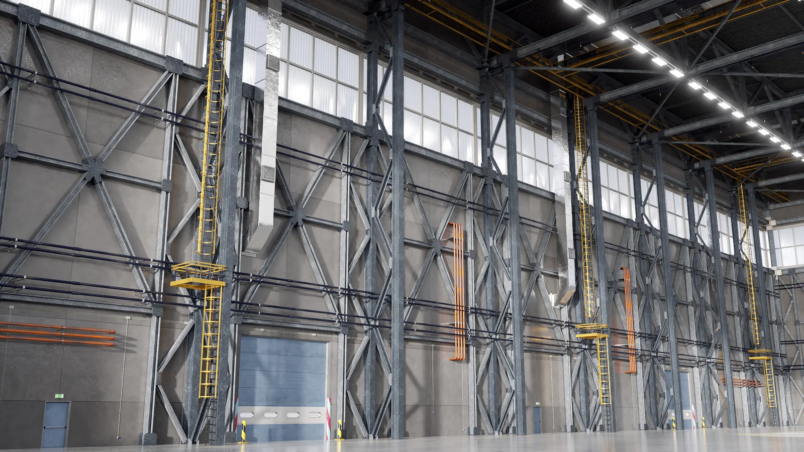 This is a high-poly 3D environment model of a large airliner hangar, built to real-world scale dimensions of 173 by 131 meters. The scene is provided in two structural variants, allowing users to include or exclude walkways along the side walls. The native Blender file comes fully configured with Cycles materials, embedded 2K and 4K textures, and a complete lighting setup, making it ready to render immediately. The package also includes exported FBX and OBJ formats alongside a separate archive for the texture files.