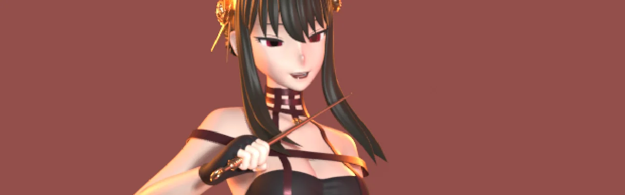 A rigged 3D character model of Yor Forger from SPY x FAMILY. The character body is rigged using Rigify, while the dress features independent posing capabilities that can be modified to follow the main armature instead. The hair is constructed using Blender curves. The face includes basic VTuber-style blend shapes for standard expressions and lip-syncing, which are controlled from the upper body object. The mesh is high-density at 700,000 triangles and comes with textures packed directly into the file.