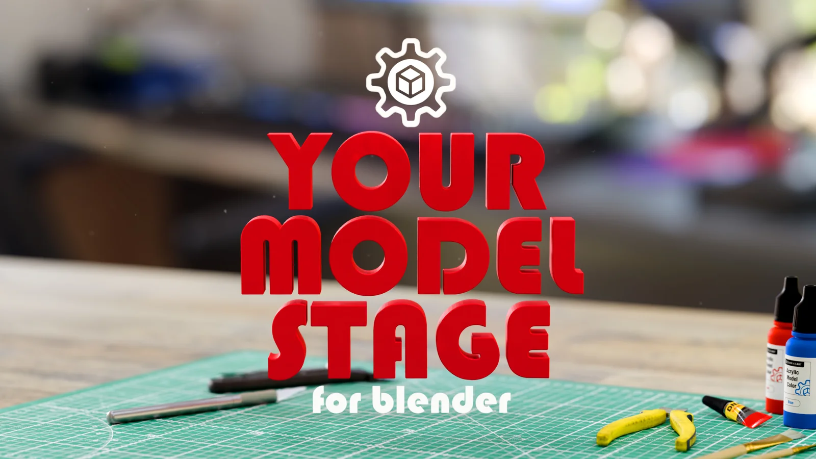This is a ready-to-use scene designed for showcasing 3D models. It provides a tabletop environment styled as a craft or hobby station, featuring a wooden table, a green cutting mat, and various small hand tools. Included props consist of a cutter knife, a 3D print scraper, a tiny screwdriver, three paint bottles, two paint brushes, pliers, and a small tube of superglue. The file contains two distinct lighting setups: an HDRI-lit scene using a Poly Haven Studio environment, and a darker, moody setup with a single moving light source. Additionally, the file includes a customizable air particle system powered by Geometry Nodes, which allows users to adjust particle size, speed, and rotation, or swap in custom geometry.