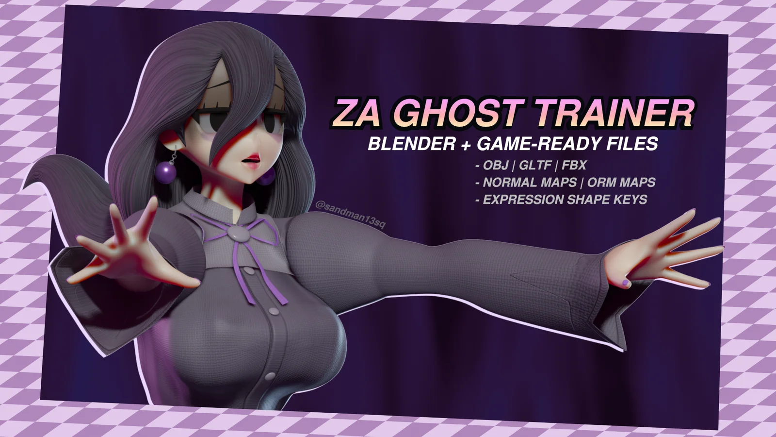 A 3D character model of the ghost lady, rumored to be a hex maniac trainer, based on the Pokémon Legends: Z-A Lumiose City map. The model includes UV mapping, baked textures, and shape keys for facial expressions. The base version provides game-ready exports in OBJ, FBX, and GLB formats alongside TGA texture maps for albedo, normals, and ORM. An expanded tier includes the source Blender file, featuring the original meshes, textures, and a full armature set up using the Rigify add-on.