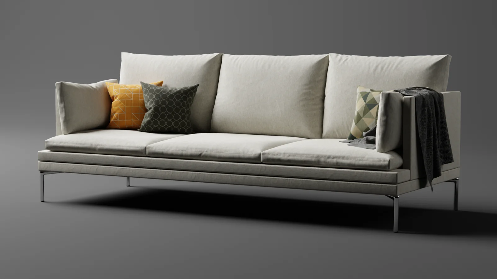 This asset provides the complete Zanotta Williams couch model featured in the creator's tutorial series. The download includes the main couch geometry along with accompanying cushion and blanket models. It comes fully textured using materials sourced from Poliigon.