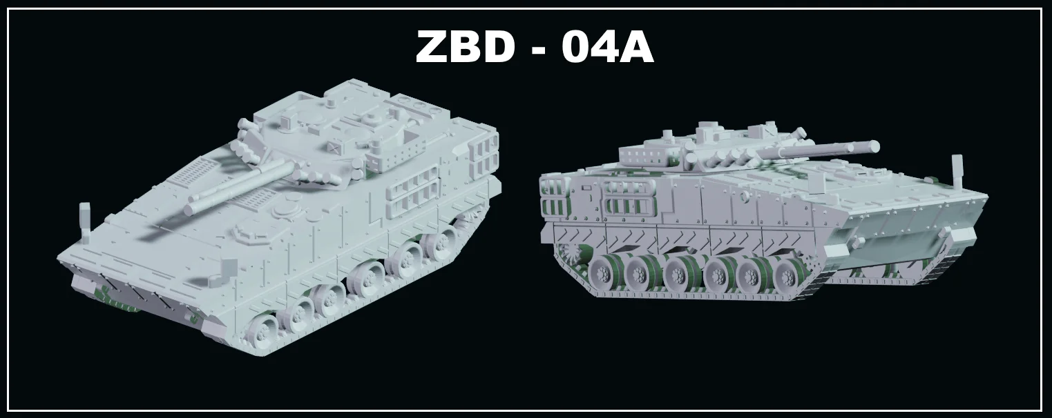 A collection of 3D printable models for the ZBD-04A infantry fighting vehicle, scaled to 1/100 (15mm scale). The set includes three distinct hull variants and two turret options, along with thickened turret versions optimized specifically for FDM printing. Both presupported and unsupported files are provided to accommodate various resin and FDM workflows.