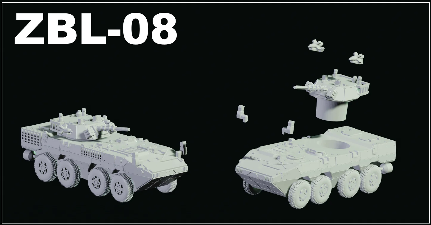 This collection provides 3D printable files for the ZBL-08 and ZTL-11 military vehicles, scaled to 1/100 (15mm). The set includes components to build both versions, alongside bonus files featuring commanders positioned in hatches. It provides prehollowed and presupported files optimized for resin printing, as well as modified thick barrel versions designed for better durability or FDM printing. Note that the included tire files represent a single side and must be mirrored in slicer software or Blender to achieve correct left and right tread patterns.