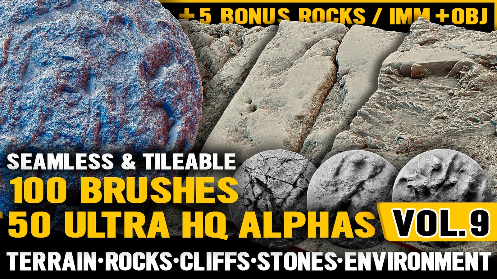 This collection provides 50 seamless alpha and height maps designed for sculpting terrain and rock surfaces. The maps are provided in 4K resolution across multiple formats, including 16-bit PSD and TIFF files, making them suitable for use as sculpt brushes or displacement textures in Blender. The package also includes 5 bonus rock meshes in OBJ format for environment detailing.
